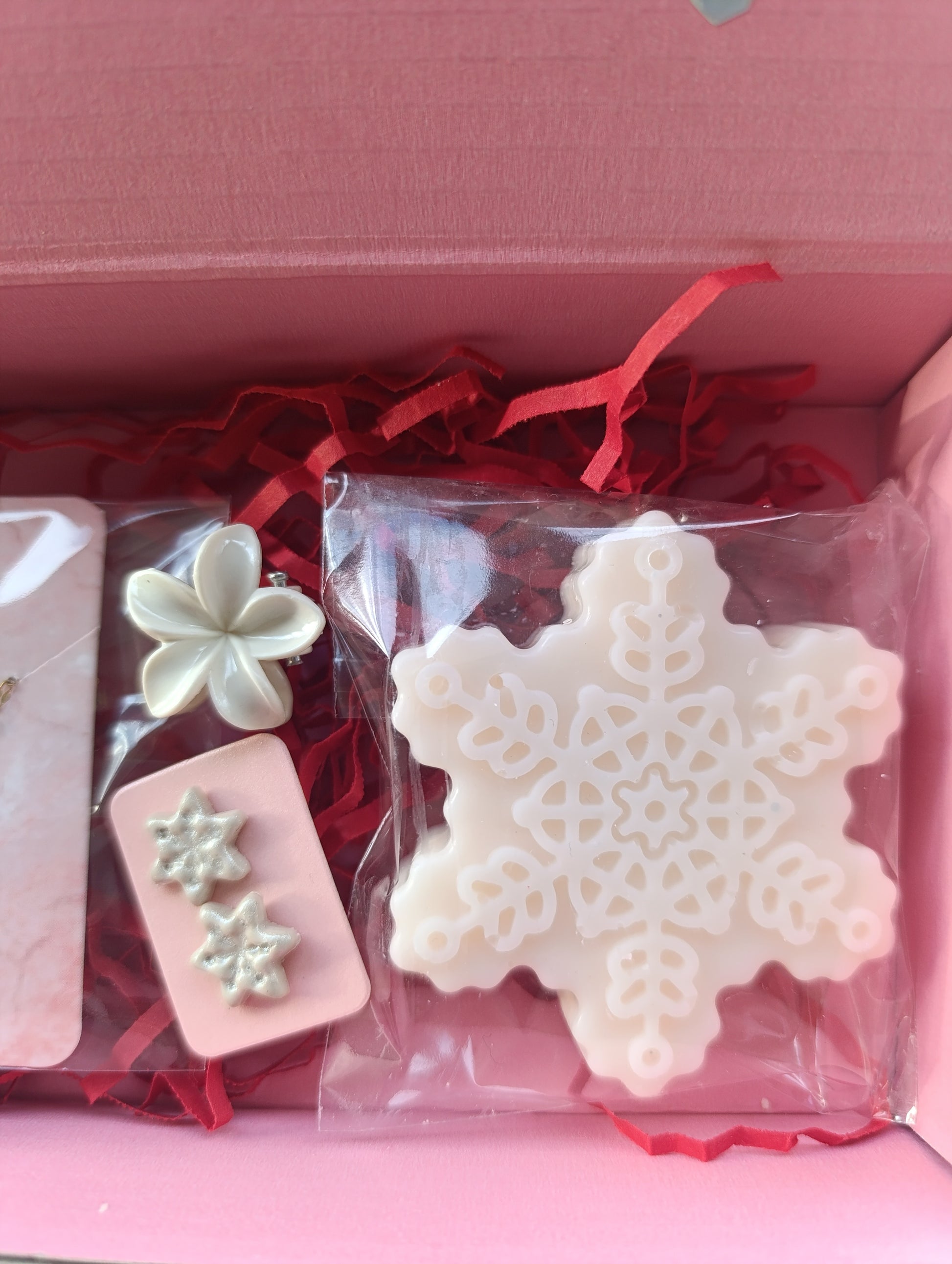 Η συσκευασία περιλαμβάνει ένα ατσάλινο κολιέ, ατσάλινα χειροποίητα σκουλαρίκια, ένα κλαμερακι και ένα wax melts με άρωμα μελομακάρονο!