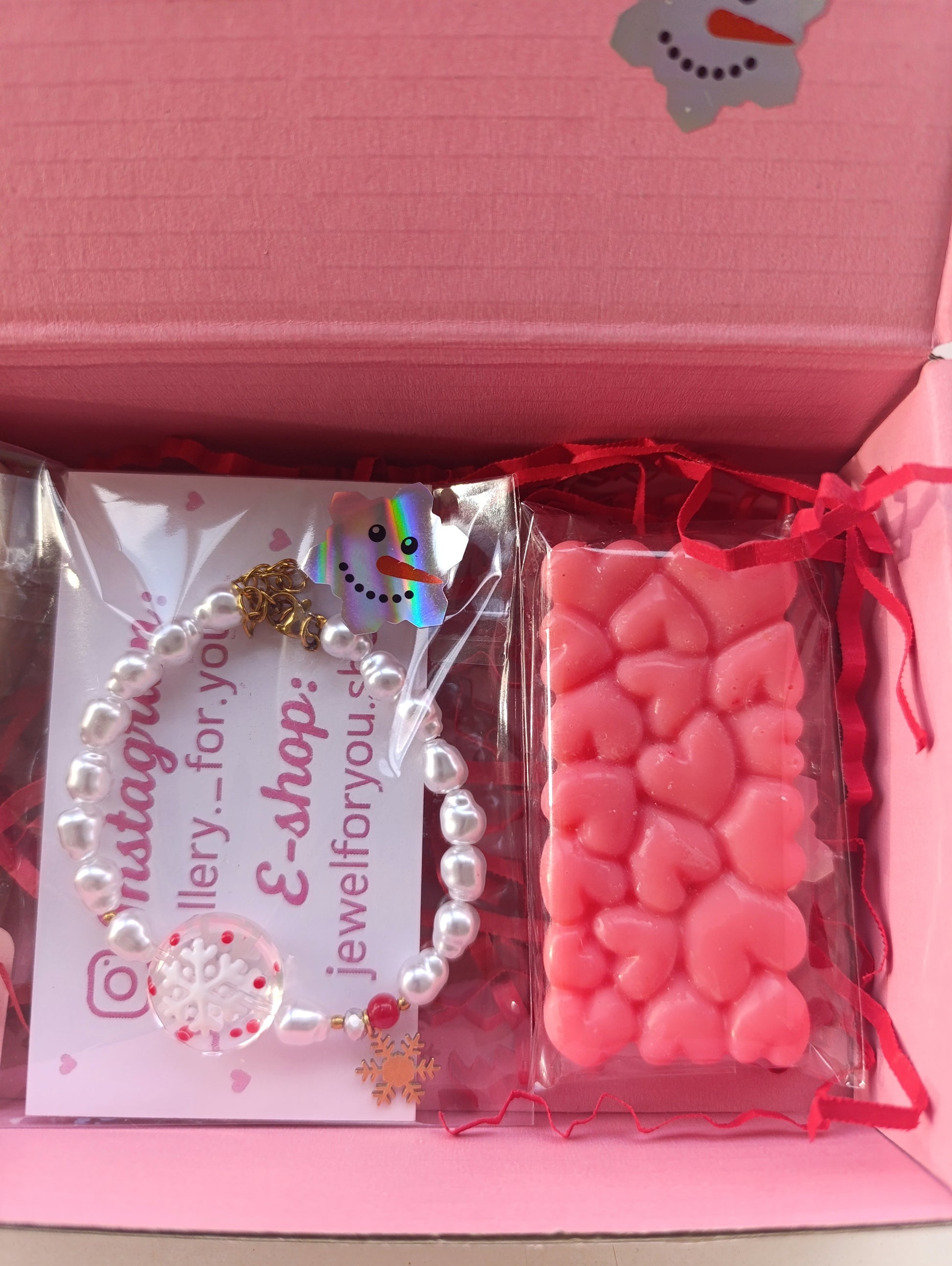 Η συσκευασία περιλαμβάνει ένα ατσάλινο δαχτυλίδι και η θήκη του , ένα κλαμερακι, ένα χειροποίητο βραχιόλι και μία mini μπάρα wax melts με άρωμα μελομακάρονο!!